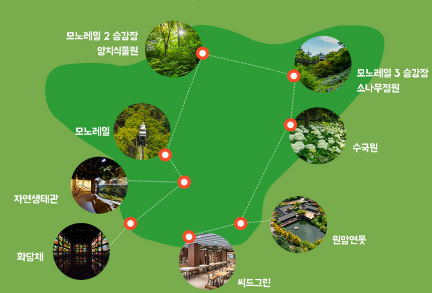 시원한 버스타고 화담숲으로👉 화담채 미디어아트 👉 자연생태관 민물고기,곤충 👉 모노레일탑승1~2승강장 👉 시원한그늘길 양치식물원 👉 모노레일 탑승 3승강장 👉 원앙연못 파전과 막걸리 👉 씨드그린 음료와맛있는빵