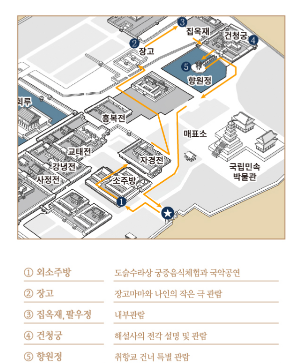 경복궁의 별빛산채로는 외소주방에서 도슭수라상 궁중음식체험과 국악공연을 즐기실수 있으며, 장고에서는 장고마마와 나인의 작은 극관람이 가능합니다. 집옥재, 팔우정은 내부관람을 하실 수 있고, 건청궁은 해설사의 전각 설명 및 관람을 즐기시고, 향원정은 취향교 건너 특별관람을 즐기실 수 있습니다.