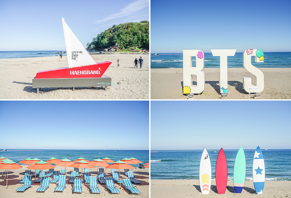 6월 여행가는 달을 맞아 다음으로 소개할 곳은 맹방해수욕장입니다. 이곳은 butter 싱글 앨범의 재킷 촬영지로도 유명한데요. 입구 쪽에 포토존도 마련되어 있어요. 평소에도 차박과 캠핑의 성지로 유명한 맹방해수욕장인데요. 시간이 흐른 요즘도 여전히 유명한 국내 여행 핫플 중 하나입니다.